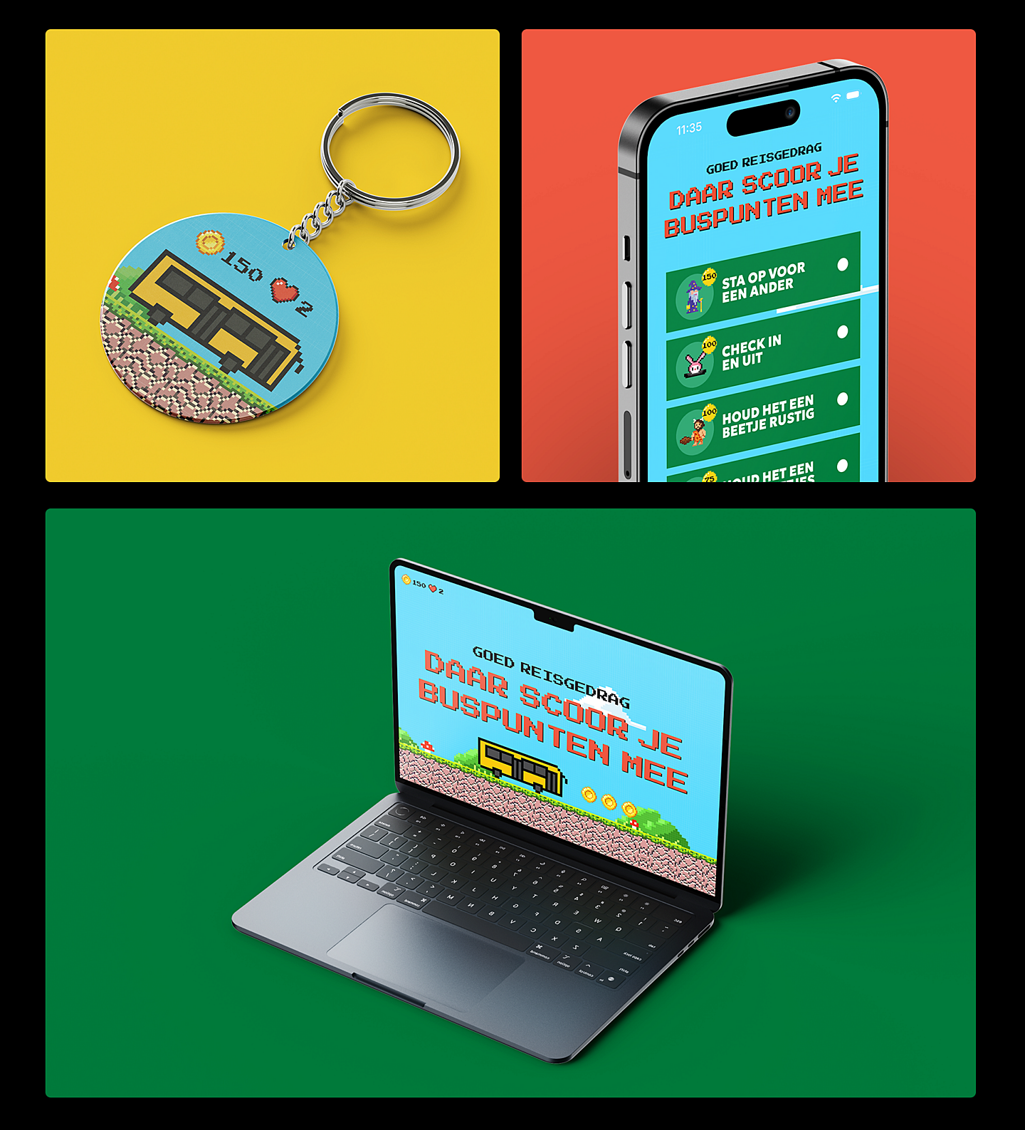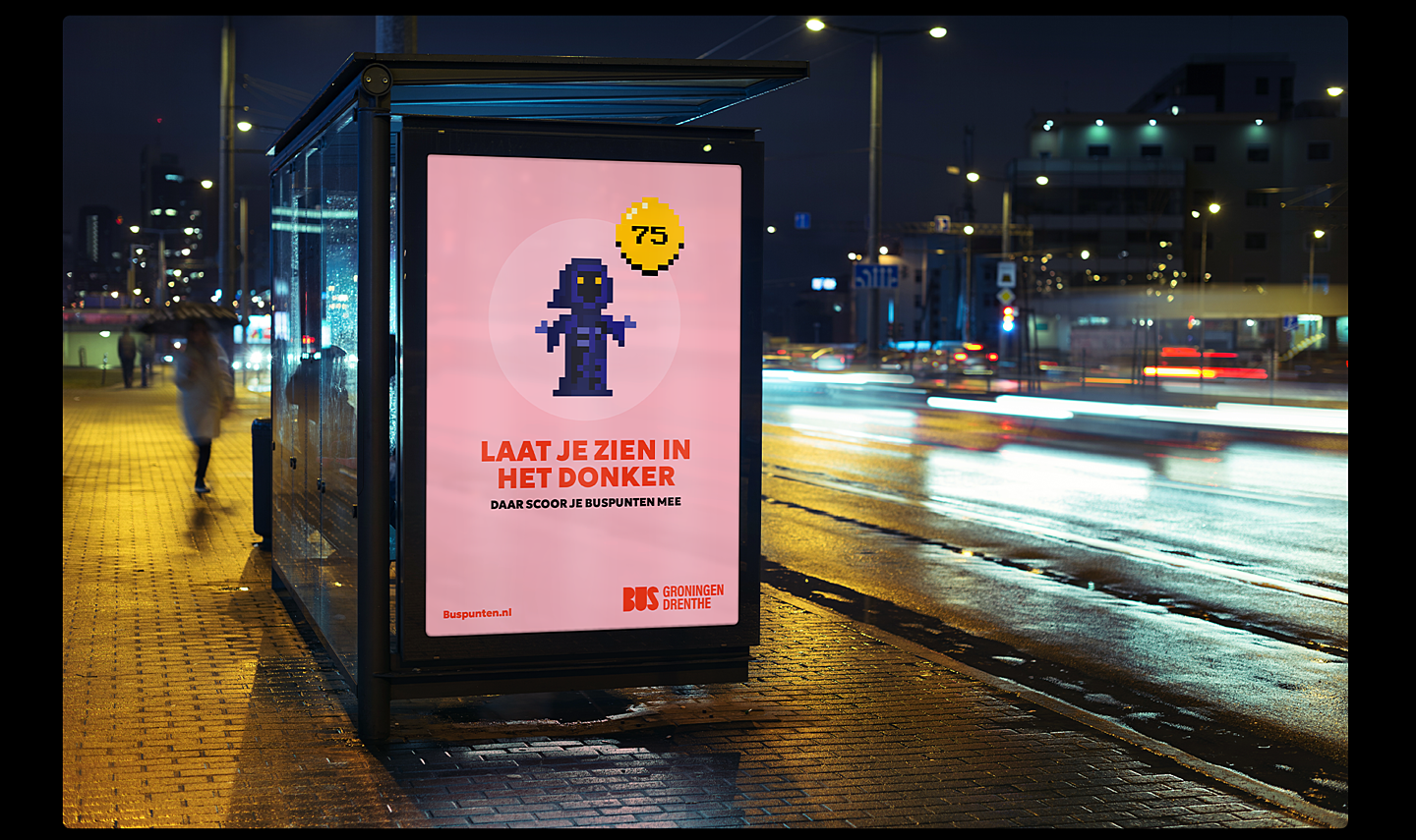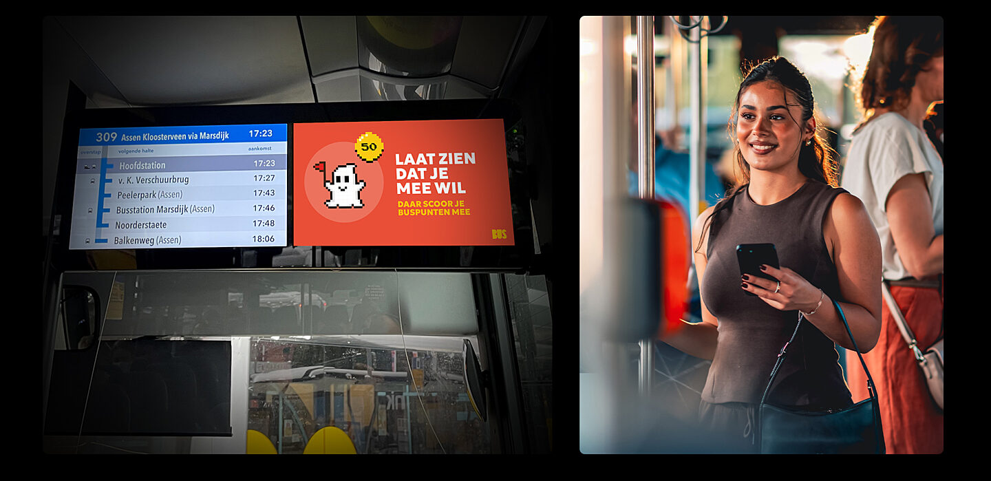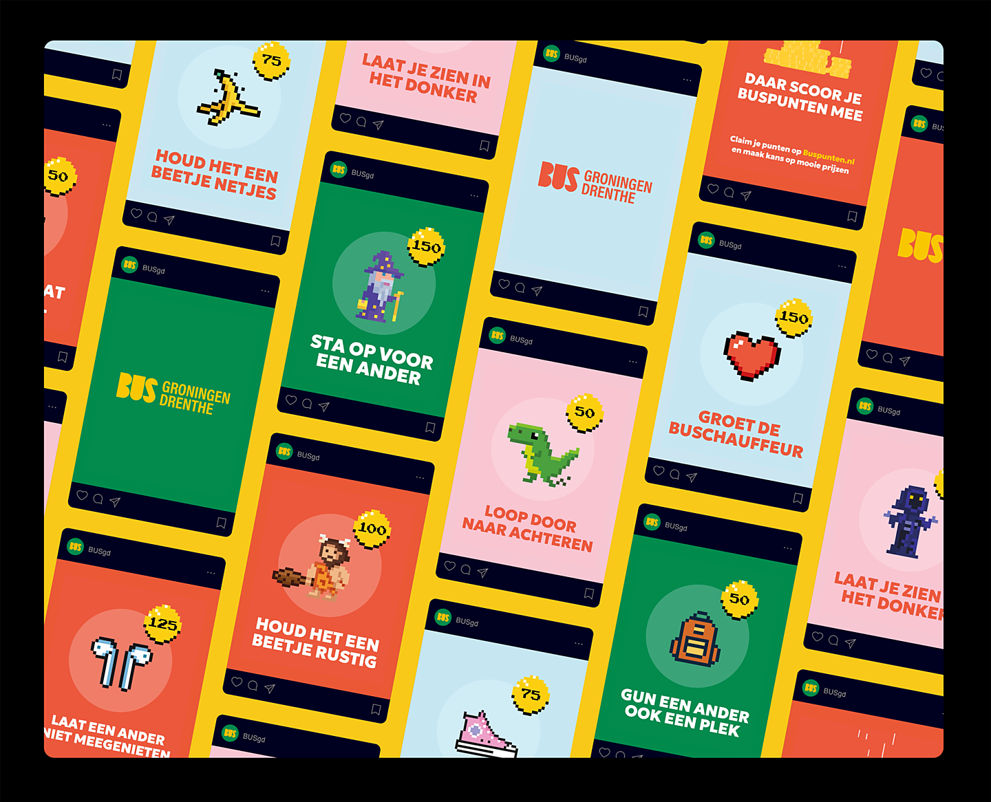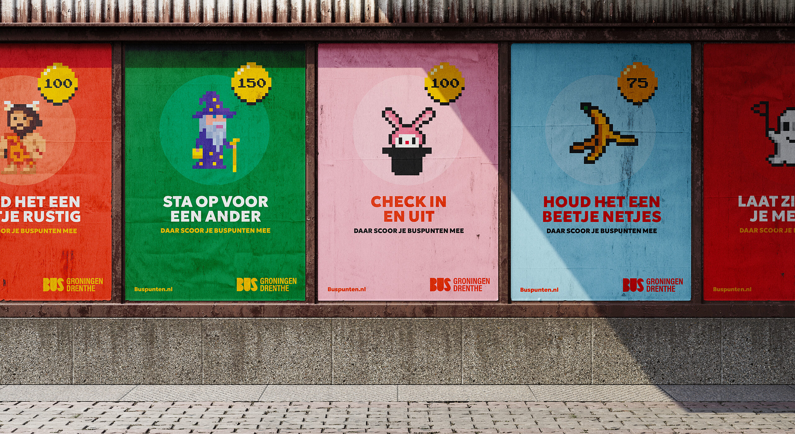 Je zou zeggen dat het heel normaal is. Dat je de buschauffeur begroet, de bus netjes houdt, andere reizigers niet tot last bent en geen zitplaatsen bezet houdt met je bagage. Maar als dat zo normaal is, dan zou iedereen het wel doen. OV-bureau Groningen Drenthe kwam bij ons met de vraag: 'hoe kunnen we onze reizigers stimuleren zich netjes aan de reisregels te houden, zodat de bus voor iedereen een fijne manier van reizen blijft? En hoe maken we dat vooral leuk en niet belerend?' Best lastig natuurlijk. De enige leuke regels zijn spelregels. Dus ja, waarom maken we er niet gewoon een spelletje van? Met goed reisgedrag scoor je buspunten. Heb je er genoeg? Dan maak je zomaar kans op mooie prijzen.