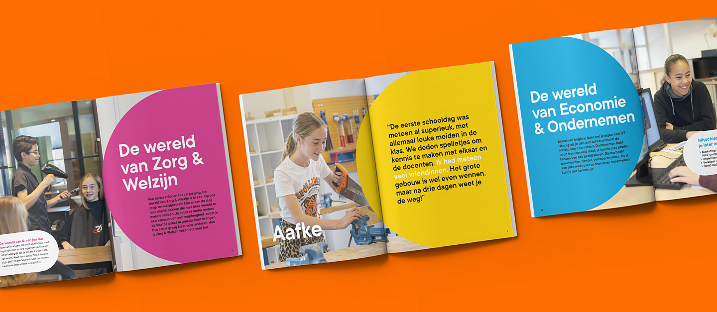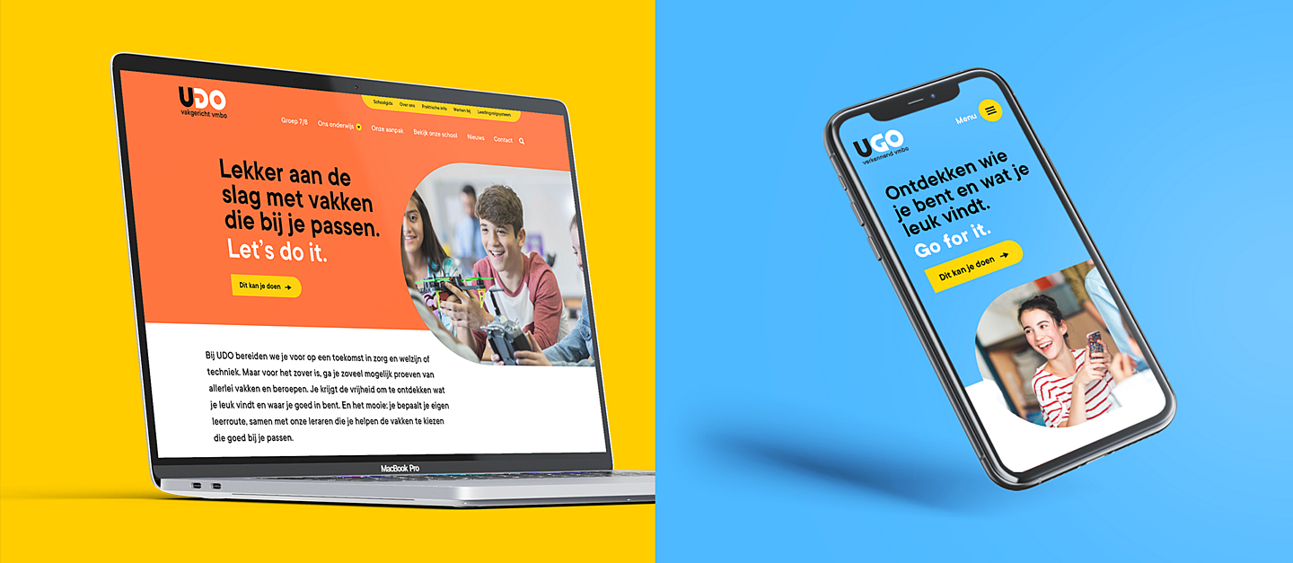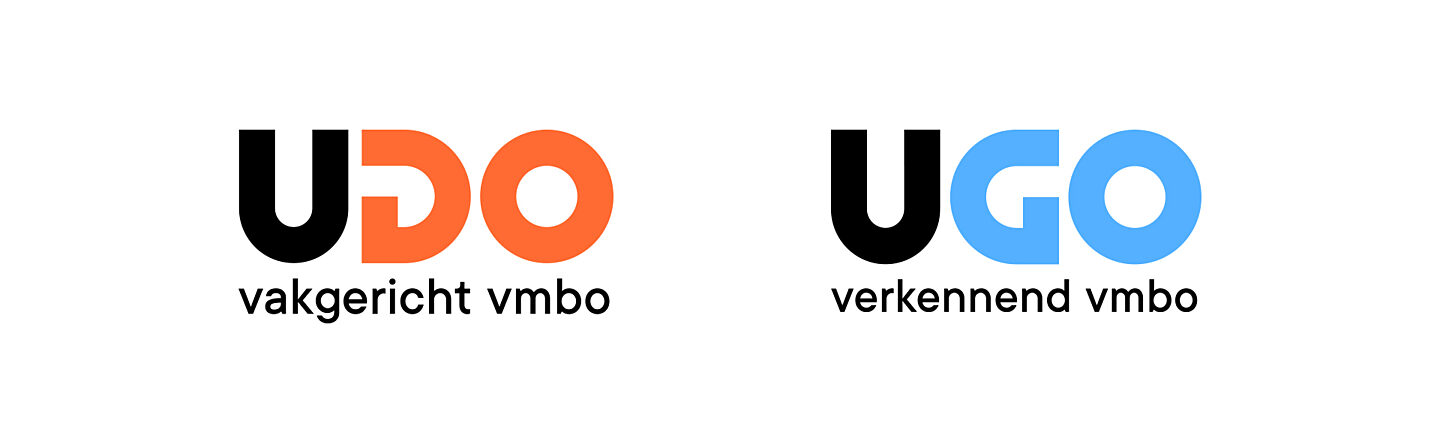 Op de middelbare school beleef je een van de mooiste en belangrijkste periodes van je leven. Spannend dus, als je een middelbare school moet uitkiezen. De drie vmbo-scholen in Apeldoorn geloven dat je met een sterk merk een goede eerste indruk kunt maken bij de leerlingen. En omdat zij samen verdergingen als twee nieuwe scholen, mochten wij die merken voor ze gaan maken. Twee volledig nieuwe merken, die wel duidelijk tot dezelfde familie behoren. En die aansluiten bij wat ze hun leerlingen te bieden hebben. Een fijne plek waar je vier jaar lang de tijd krijgt om te ontdekken wie je bent en wat je leuk vindt, door lekker veel te doen en te proberen. Hieruit zijn de merken UDO (you do) en UGO (you go) geboren. Jong, fris en vol positieve energie, net als de leerlingen, hun nieuwsgierigheid en hun creativiteit.